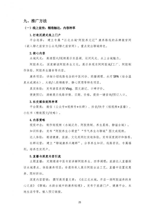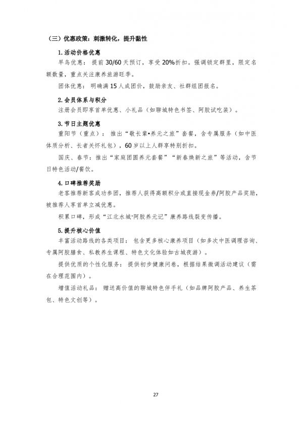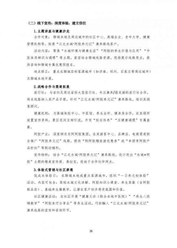 旅行社:與省內及周邊省份大型旅行社、專注康養(yǎng)/銀發(fā)游的旅行社合作,將本線路納入其產品手冊,針對“江北水城·阿膠養(yǎng)元記”康養(yǎng)路線,培訓其銷售顧問。
