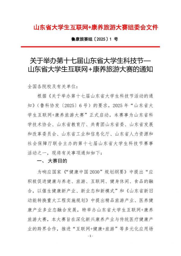根據(jù)《關(guān)于舉辦第十七屆山東省大學(xué)生科技節(jié)活動(dòng)的通知》(魯科協(xié)發(fā)〔2025〕6 號(hào))的要求,2025 年“山東省大學(xué)生互聯(lián)網(wǎng)+康養(yǎng)旅游大賽”正式啟動(dòng)。本賽事為山東省科學(xué)技術(shù)協(xié)會(huì)、山東省教育廳、共青團(tuán)山東省委、山東省發(fā)展和改革委員會(huì)、山東省工業(yè)和信息化廳、山東省人力資源和社會(huì)保障廳聯(lián)合主辦的第十七屆山東省大學(xué)生科技節(jié)賽事 活動(dòng)之一,現(xiàn)將有關(guān)事項(xiàng)通知如下: