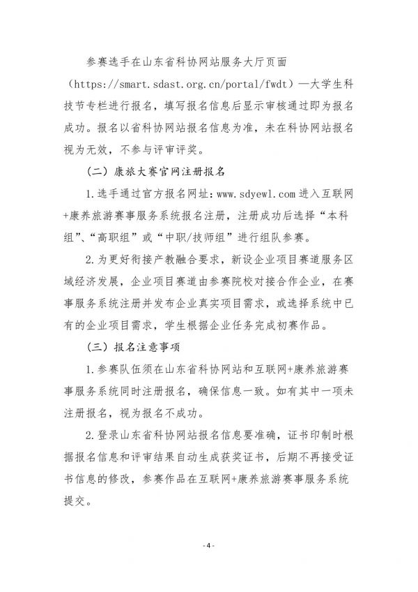 1.參賽隊(duì)伍須在山東省科協(xié)網(wǎng)站和互聯(lián)網(wǎng)+康養(yǎng)旅游賽事服務(wù)系統(tǒng)同時(shí)注冊(cè)報(bào)名,確保信息一致。如有其中一項(xiàng)未注冊(cè)報(bào)名,視為報(bào)名不成功。