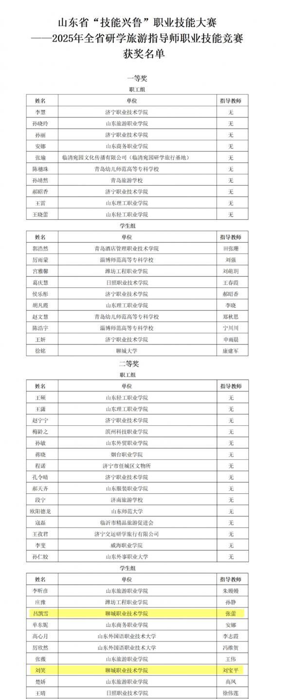 11月7日,山東省“技能興魯”職業(yè)技能大賽——2025年全省研學旅游指導師職業(yè)技能競賽獲獎名單正式公布,聊城職業(yè)技術學院喜訊頻傳:該校劉笑、呂凱雪兩位選手在劉寶平老師、張蕾老師的指導下榮獲省賽二等獎。