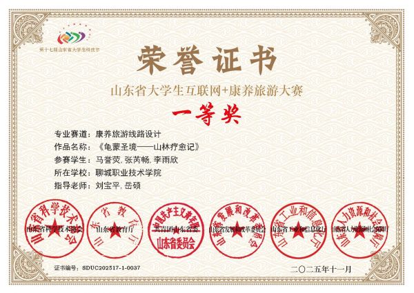 11月13日,第十七屆山東省大學生科技節(jié)——山東省大學生互聯網+康養(yǎng)旅游大賽獲獎名單公示,在劉寶平、岳碩兩位老師的指導下,聊城職業(yè)技術學院劉寶平師生工作室成員馬譽熒、張芮暢、李雨欣憑借“康養(yǎng)旅游線路設計”作品脫穎而出,成功摘得賽事一等獎。