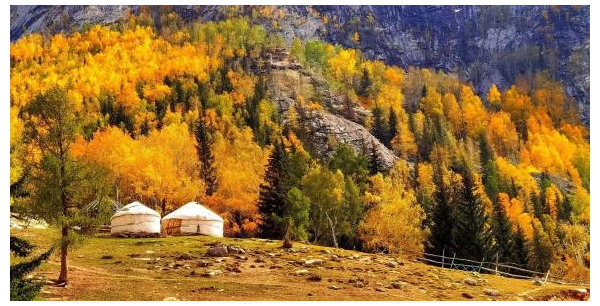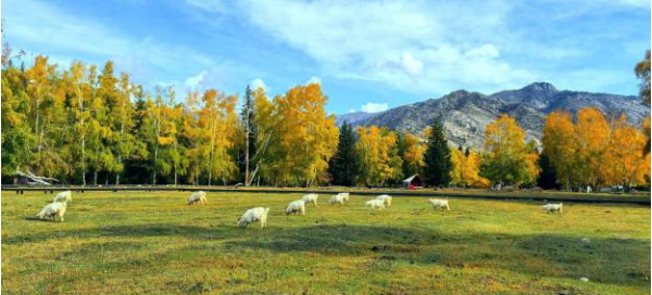 隨后的時光造訪了塔拉特民俗村。這座藏在阿爾泰山間的哈薩克族村落正被豐收的喜悅包裹,居民的院子里晾曬有金黃的玉米,屋檐下掛著一串串紅辣椒,牛羊在村外的草地上悠閑啃食,遠(yuǎn)處傳來幾聲牧人的吆喝,充滿了生活氣息。走進(jìn)一戶村民家,主人熱情地端上醇厚香甜的奶茶與外酥里嫩的馕餅。陽光透過氈房的格窗灑進(jìn)來,在地上投下斑駁的光影。坐在鋪著絨毯的炕上聽?wèi)糁髦v述生活點滴,忽然覺得所謂歲月靜好,大抵就是這煙火尋常吧。