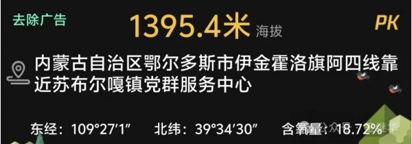今天早晨起床搜百度這里海拔1395.4米在內(nèi)蒙古自治區(qū)鄂爾多斯市伊金霍洛旗阿四線靠近蘇布爾嘎鎮(zhèn)黨群服務中心東經(jīng):109°27'1”北緯:39°34'30"含氧量:18.72%
