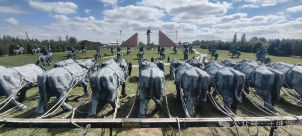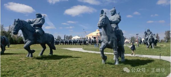 從蒙古包到成吉思汗陵,不過四分鐘車程。車剛停穩(wěn),仰頭便見“氣壯山河”石門劈開蒼穹,氣勢撼人。劉總摸著銅鑄的鐵馬金帳群雕感嘆:“你看這馬鬃,風(fēng)從哪個方向來,它就朝哪個方向揚?!痹捯粑绰?,一陣風(fēng)恰好掠過,雕像鎧甲上的浮塵簌簌掉落,恍惚間真有戰(zhàn)馬嘶鳴穿透時空,在耳畔回響。