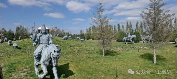 陵宮主殿的穹頂靜臥在碧草間,像一顆不慎落在綠毯上的珍珠。據(jù)說1954年國家就撥款興建了這座陵寢,走進大門,12.5米高的成吉思汗騎馬雕像立在中央,像從天而降無比威武,他的目光越過遠方,仿佛仍在凝視親手開拓的疆域。