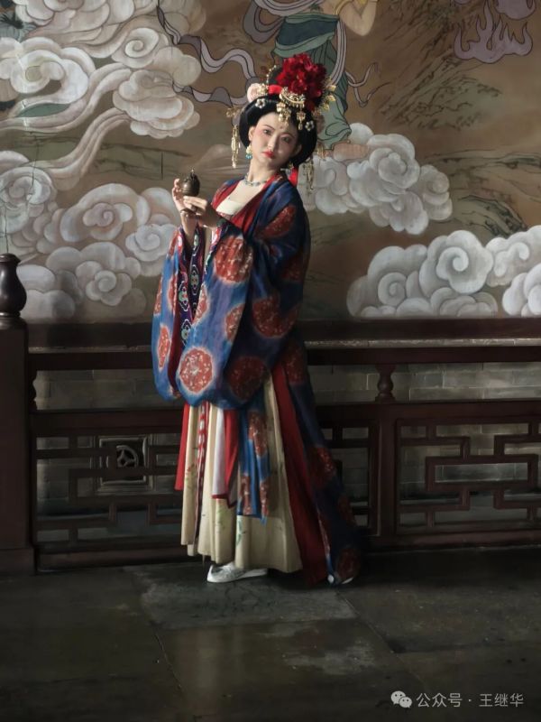 正欲細(xì)賞壁上壁畫(huà),卻見(jiàn)殿外廊下閃過(guò)一抹亮色——幾位女子身著唐裝,對(duì)襟襦裙被雨水打濕了邊角,發(fā)間銀簪卻依舊耀眼。她們?nèi)徊活櫤?,或倚著紅柱整理裙擺,或舉著相機(jī)對(duì)著經(jīng)幢取景,笑鬧聲穿過(guò)雨幕,為肅穆的古寺添了幾分鮮活。