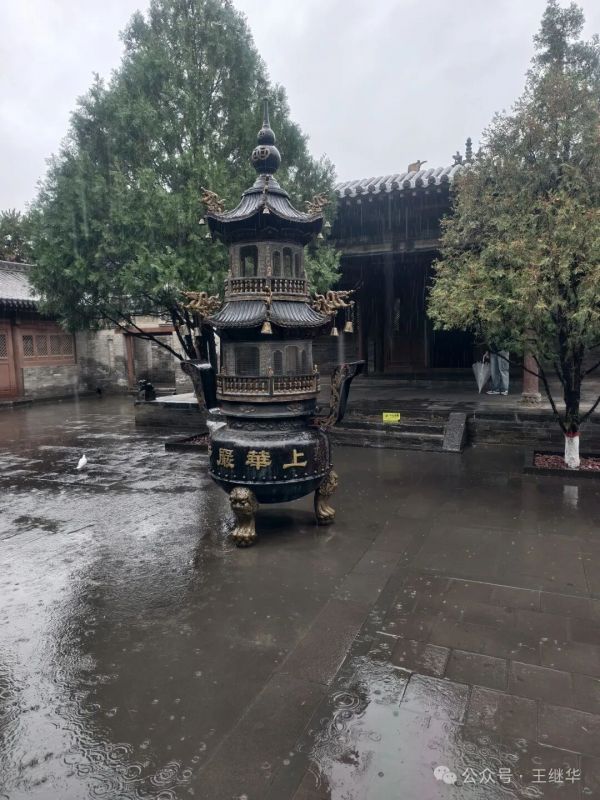 離開(kāi)前在普賢閣旁,導(dǎo)游指著樓閣飛檐:“金代修這座閣時(shí),特意讓檐角向外翹得更陡,就是為了讓雨水更快落下,保護(hù)木構(gòu)?!庇赀€沒(méi)停,褲腳已濕得透涼,手腳凍得發(fā)麻,可想起她講的古建智慧,倒覺(jué)得這場(chǎng)低溫冷雨,讓善化寺的千年故事聽(tīng)得更清楚——原來(lái)時(shí)光從不是悄無(wú)聲息的,它藏在雨滴敲打的節(jié)奏里,藏在木構(gòu)呼吸的紋理中。
