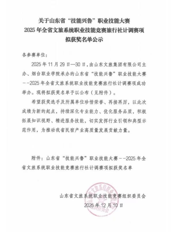 12月11日,山東省“技能興魯”職業(yè)技能大賽旅行社計調(diào)賽項獲獎名單正式發(fā)布。由聊城市精品旅游促進會旅行社專委會會長劉寶平帶領(lǐng)的聊職院師生團隊,憑借扎實的專業(yè)功底與出色的實操能力在賽事中脫穎而出,一舉斬獲多項榮譽。