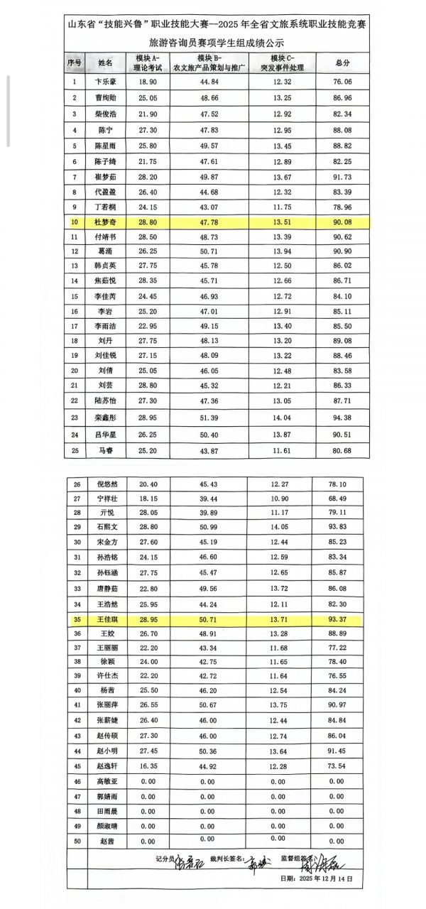 12月14日,2025年山東省“技能興魯”職業(yè)技能大賽全省文旅系統(tǒng)旅行社咨詢員賽項順利收官,聊城職業(yè)技術(shù)學(xué)院學(xué)生表現(xiàn)亮眼,佳績的背后,離不開劉寶平老師和李雁老師的悉心點撥與傾囊相授,從賽事要點拆解到實戰(zhàn)模擬演練,他們始終與選手并肩前行。聊城職業(yè)技術(shù)學(xué)院文旅學(xué)子杜夢奇和王佳琪出征賽場,以專業(yè)為刃、以匠心為鋒,在全省200余支隊伍的激烈角逐中突圍,將一等獎、二等獎收入囊中,盡顯青春風(fēng)采。