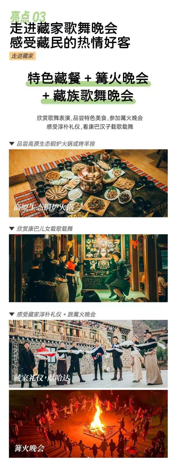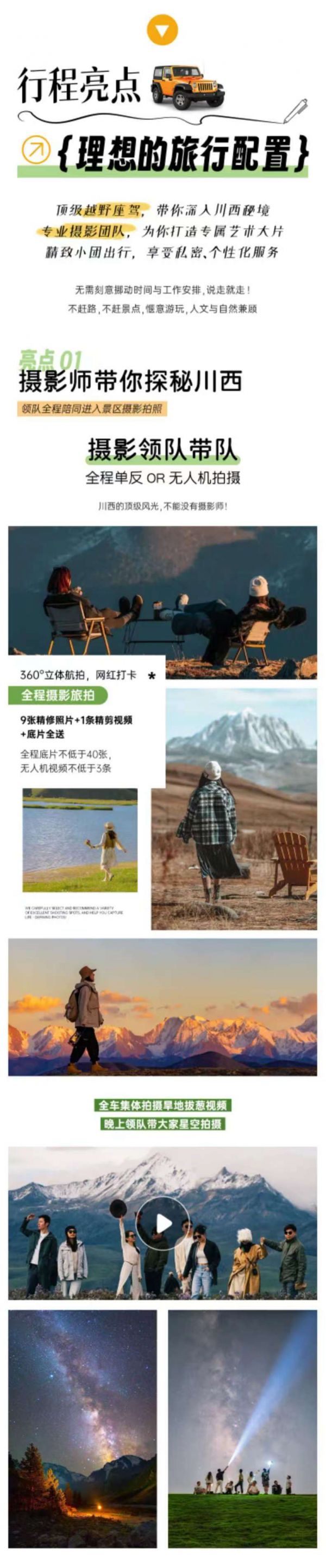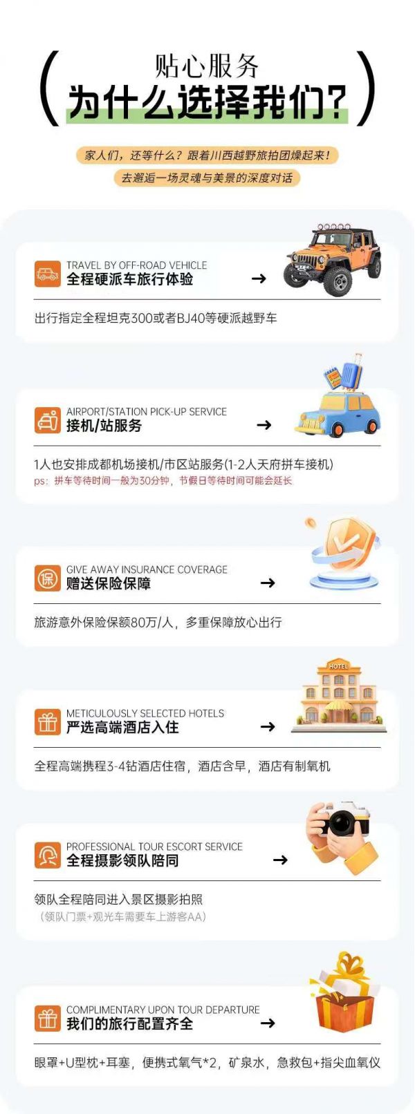 無人機(jī)+單反旅拍(底片全送+9張精修照片+1條精剪視頻),底片全程不低于40張,無人機(jī)視頻不低于3條(全車人拍攝旱地拔蔥視頻,晚上領(lǐng)隊帶大家星空拍攝);贈送藏服旅拍(6張底片+3張精修),全場衣服通選(除了三款羊皮襖)+精妝+精造;隨車便攜式氧氣瓶每人2瓶、旅行三寶1套/人、撒隆達(dá)1份;隨車配備礦泉水、急救包、指尖血氧儀;贈送特色土火鍋+篝火晚會+藏族歌舞表演晚會;可免費提供露營桌椅板凳爐具,可以野餐(食材車上游客一起AA),需提前預(yù)約;體驗藏區(qū)文化特色-畫唐卡;包含80w旅游意外險(不含財產(chǎn)險);包含成都機(jī)場接機(jī)/市區(qū)接站服務(wù)1次(1-2人安排天府機(jī)場拼車接機(jī))。
