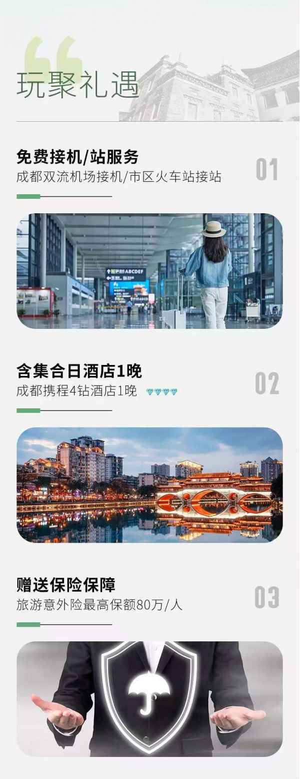 (1)此日不含住宿,如需代定,請?zhí)崆白稍兛头聠危?br /> (2)如果需要當(dāng)天離開成都,建議訂晚上22:00以后的航班。由于返回路程較長,可能會因為修路、交通管制,堵車耽誤時間,實際到達(dá)時間可能更晚,最好是預(yù)訂次日返程大交通。