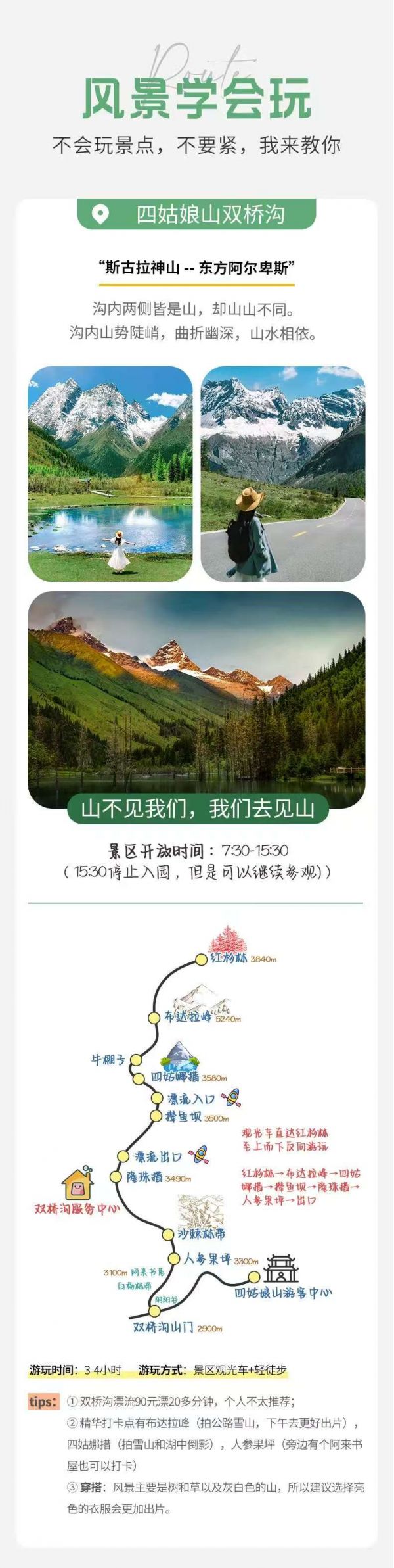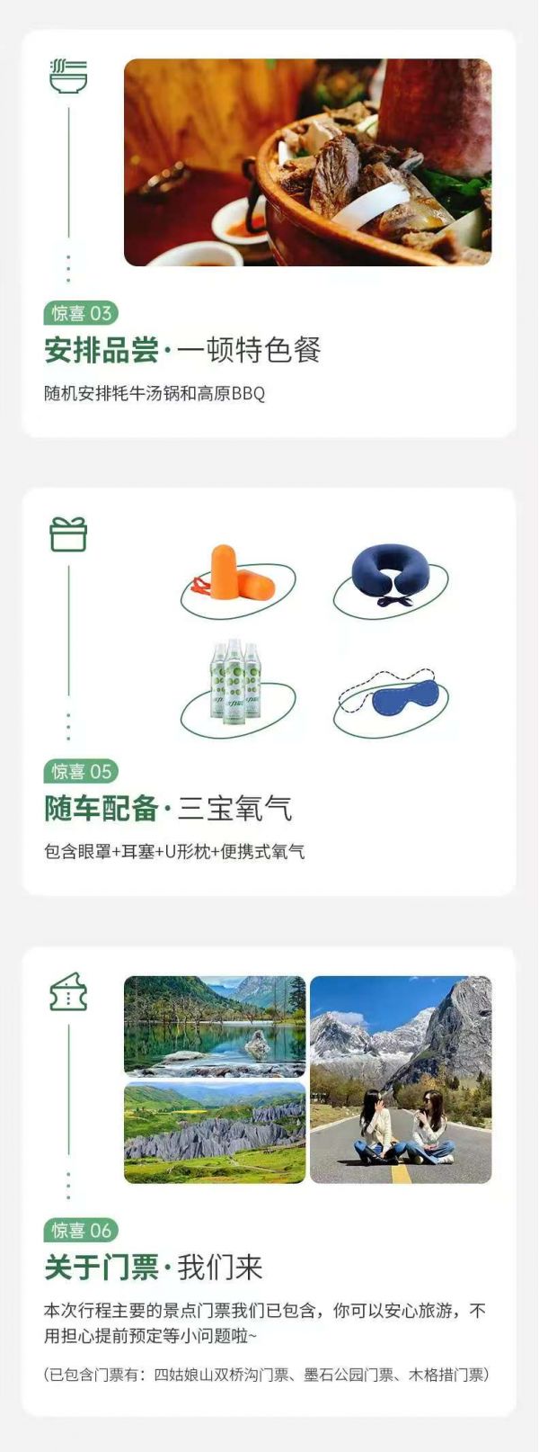 初到高原,建議緩步行走,適應(yīng)高原氣候,尊重少數(shù)民族風(fēng)俗習(xí)慣。因雙橋溝有限流要求,如遇票滿,我們將更換安排海子溝和長坪溝的門票,以上兩個景點也同屬四姑娘山。
