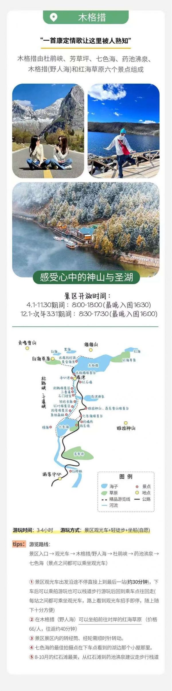 前往木格措景區(qū),大概游玩3-4小時左右,景區(qū)內(nèi)除可觀賞”臥虎觀月”、“石佛鎮(zhèn)海”等山景外,在各個季節(jié)的不同時辰還可觀賞到“雙霧墜?!?、“木格夕照”、“木格晨曦”、“木格潮汐”和迭瀑飛泉等云、霞、霧、水奇景,海濱珍珠沙灘可享沙浴、日光浴之樂。