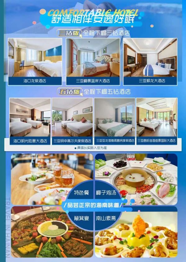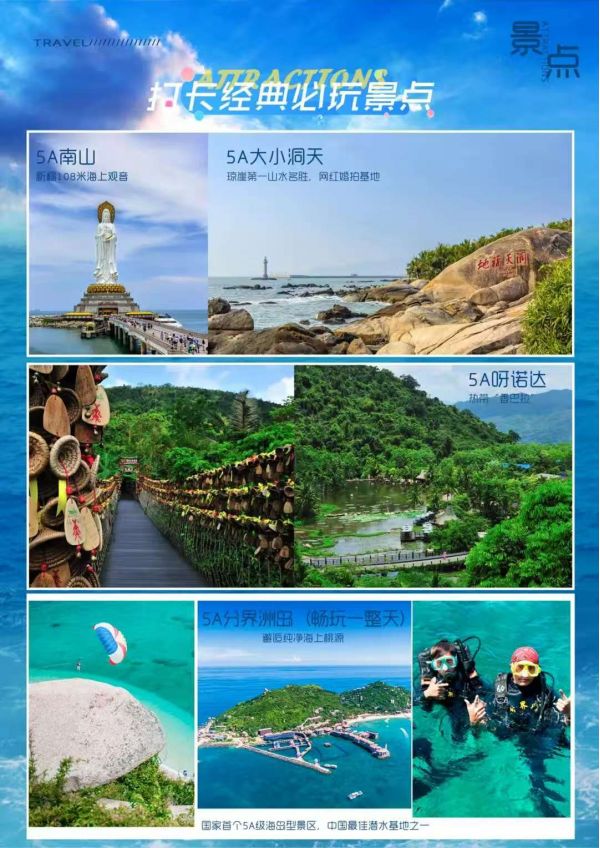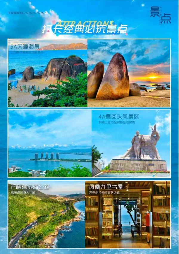 【大小洞天】國家5A級景區(qū)(時間不少于120分鐘):至今已有800多年歷史。大小洞天融匯了秀麗的海景、山景和石景,既可以看到“小洞天”、“海山奇觀”、“仙人足”等摩崖石刻,還能參觀號稱植物中的“活化石”南山不老松。【天涯海角】國家5A級景區(qū)(游覽時間不少于120分鐘):情侶們神往的圣地,不僅有南天一柱,日月神石,豐富的打卡點能戳中你所有的浪漫神經,小紅書火出圈的天涯書局、火車、情侶樹,還有婚拍基地的教堂、熱氣球、粉色城堡都超級出片。