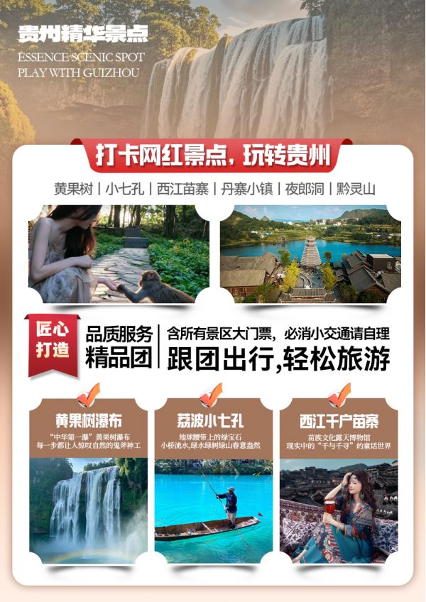 門票:含黃果樹景區(qū)大門票、小七孔景區(qū)大門票、西江千戶苗寨大門票、夜郎洞大門票