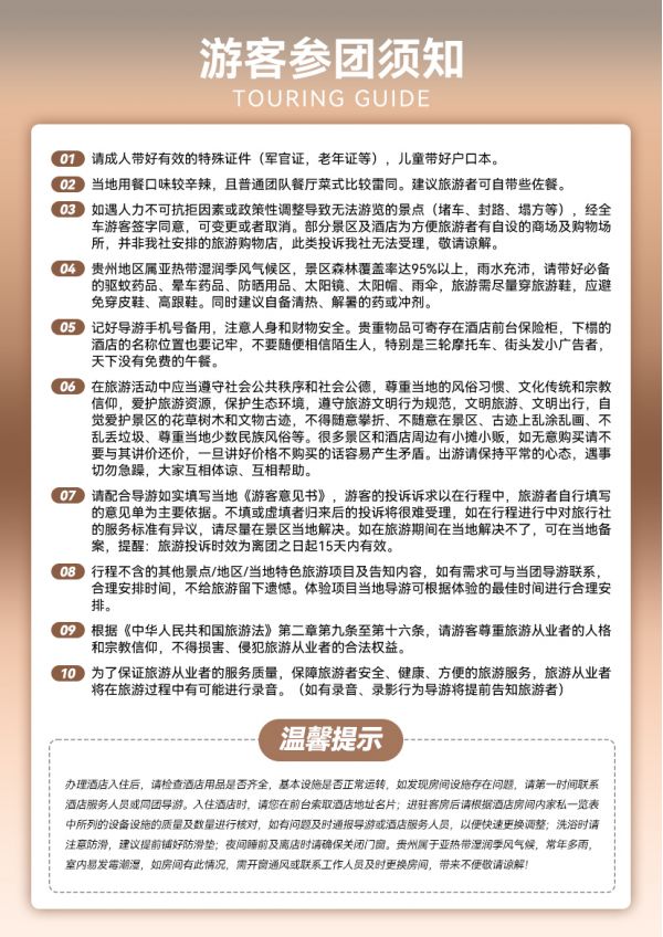 溫馨提示:當(dāng)天導(dǎo)游會(huì)以短信或電話形式通知次日出行時(shí)間和注意事項(xiàng),請(qǐng)保持手機(jī)暢通。