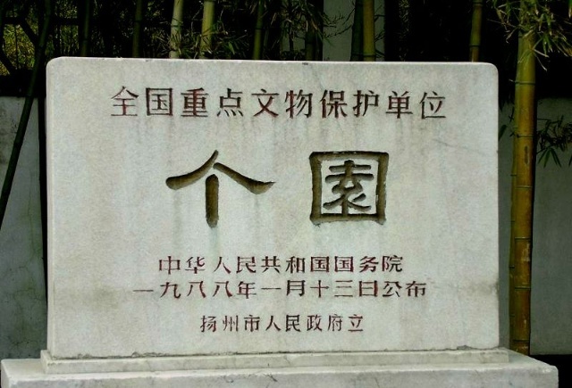 揚(yáng)州有座私家園林,叫作個(gè)園,由兩淮鹽業(yè)商總黃至筠建于清嘉慶23年(公元1818年)。設(shè)計(jì)者將春、夏、秋、冬四季假山設(shè)置在一園之中,人們可以隨時(shí)感受四時(shí)美景,并周而復(fù)始,頗具“壺天自春”之意。這種獨(dú)特的藝術(shù)手法在我國傳統(tǒng)園林中是極為少見的。個(gè)園旨趣新穎,結(jié)構(gòu)嚴(yán)密,是中國園林的孤例,也是揚(yáng)州最富盛名的園景之一。1988年被授予“全國重點(diǎn)文物保護(hù)單位”,位列中國四大名園之一。