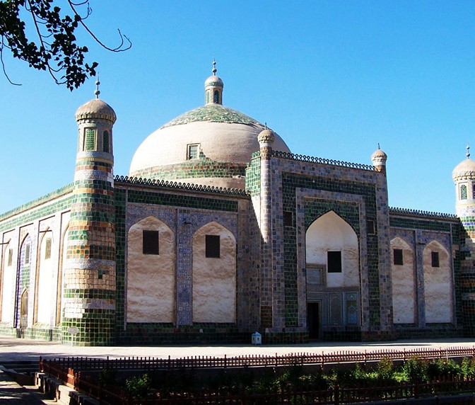 香妃墓坐落在喀什市東郊5千米的浩罕村,系自治區(qū)的重點文物保護單位。這是一座典型的伊斯蘭古建筑群,也是伊斯蘭教圣裔的陵墓,占地2公頃。 據(jù)說墓內葬有同一家族的五代72人(實際只見大小58個墓穴)。