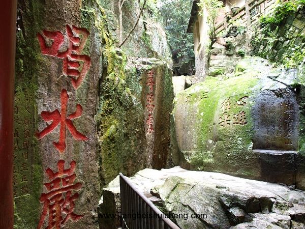 1.宋時(shí)徐錫之題喝水巖詩(shī):“重巒復(fù)嶺鎖松關(guān),只欠泉聲入座間;我若當(dāng)年侍師側(cè),不教喝水過(guò)他山” 認(rèn)為此處重巒疊嶂,不可無(wú)水;當(dāng)年要是他在,就會(huì)勸法師不要讓溪水改道。用反意評(píng)說(shuō)歷史傳說(shuō),亦饒有風(fēng)趣。