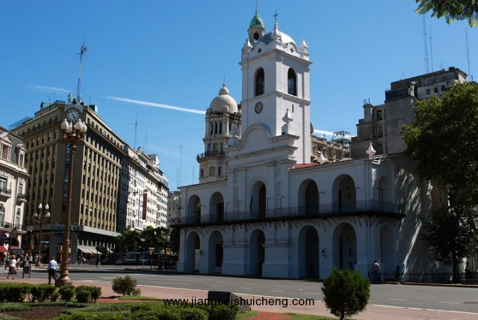 阿根廷國(guó)會(huì)大廈位于國(guó)會(huì)廣場(chǎng)西端,是阿根廷的立法機(jī)關(guān),大廈于1887年至1906年建成。大廈主體有4層,以白色大理石裝飾墻面,帶雕飾的希臘式立柱環(huán)繞整個(gè)建筑。大廈正中高高聳起一座穹頂塔樓,塔身半腰處,一輛青銅四架馬車凌空欲飛,最高處是直徑20米的青銅穹頂。建筑的氣勢(shì)與精美,不輸于華盛頓的國(guó)會(huì)大廈。屹立在大廈前面的兩會(huì)紀(jì)念碑氣勢(shì)宏偉,工藝精美。