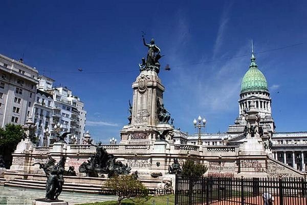 大廈前屹立著氣勢(shì)宏偉,造型別致精美的兩會(huì)紀(jì)念碑。紀(jì)念碑底座是一個(gè)寬闊的花崗巖平臺(tái),四個(gè)角上雄踞著展翅欲飛的銅塑雄鷹,紀(jì)念碑頂上站立著一尊代表共和國(guó)的婦女銅像,她右手持象征勝利的月桂枝,左手扶犁代表勞動(dòng),腳下踏著一條毒蛇,表示懲戒邪惡。版權(quán)所有山東聊城聊之旅國(guó)際旅行社有限公司,轉(zhuǎn)載必究!紀(jì)念碑的中部?jī)蓚?cè),各有一個(gè)婦女雕像,一個(gè)高舉掙斷了的鐵鏈,象征1813年大會(huì),另一手拿國(guó)旗、國(guó)徽,象征1816年議會(huì)。緊靠紀(jì)念碑底座前邊有一座音樂(lè)噴泉。花崗巖的水池周?chē)?,有一組生動(dòng)的銅雕。一個(gè)男青年腰圍飄逸的布裙,象征著奔流的拉普拉塔河水,他身邊兩位捧罐倒水的婦女則代表拉普拉塔河的兩個(gè)支流,在他們前面有四匹駿馬好似從水中騰躍而起,馬口也是噴泉的出水口,此外還有造型逼真的蜥蜴、水蛇等拉普拉塔河流域的動(dòng)物。音樂(lè)聲起,水柱騰空,隨著節(jié)拍搖弋起舞。夜晚配以變幻的燈光,場(chǎng)面更加迷人。