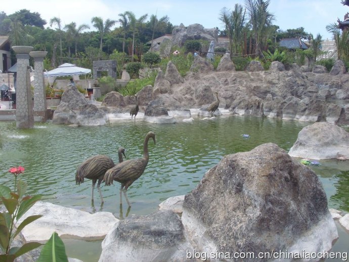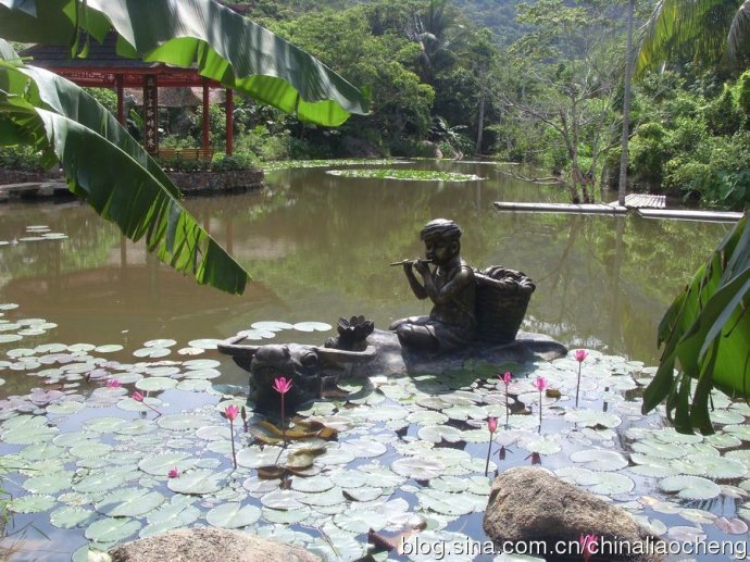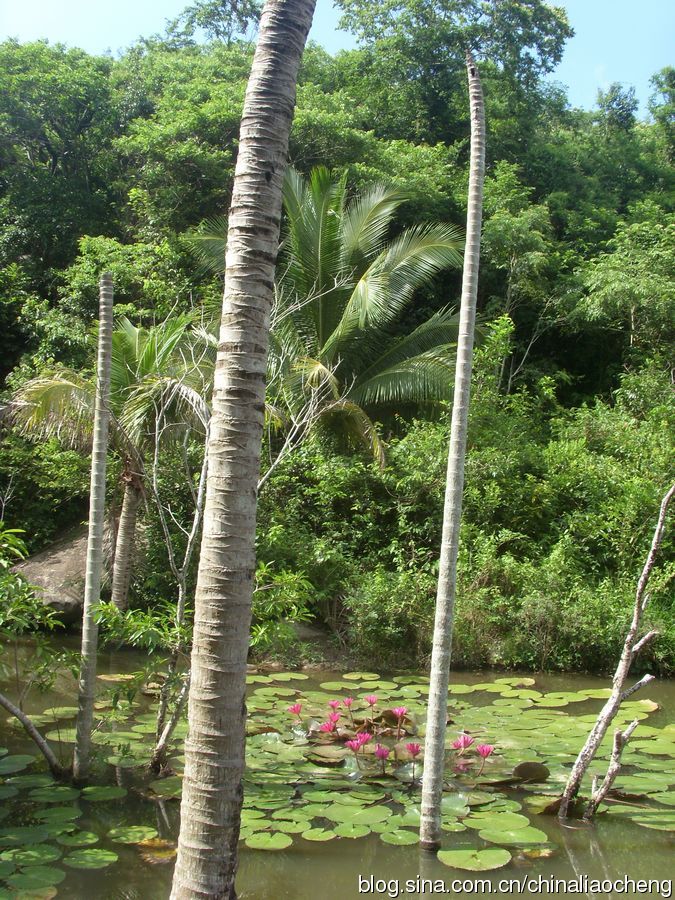 蔥翠的熱帶樹木栽種在各處,高高的直插云霄。水中荷葉漂浮,荷花朵朵,好美的一幅水彩畫??!