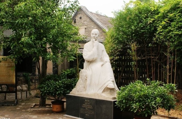 走進(jìn)大門便是故居前院,各位朋友面前的這尊漢白玉石雕坐像,就是蒲松齡先生了。他正在捻須沉思,似乎在構(gòu)思聊齋故事哦!