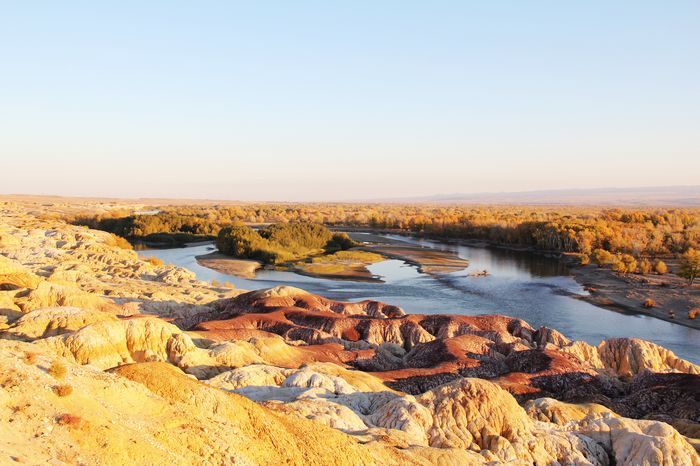 五彩灘位于阿勒泰地區(qū)布爾津縣境內(nèi),額爾齊斯河北岸,它是懸崖式的雅丹地貌,山勢起伏、顏色多變,這里的巖石以紅色為主,間以綠、黃、白、黑及過渡色彩,在不同光線照耀下,更加色彩斑斕、嬌艷嫵媚, 一般的雅丹地貌周圍都是戈壁荒漠景觀,但五彩灘的奇妙和非凡之處在于,它處在美麗的額爾齊斯河谷里,河對面是一片郁郁蔥蔥的綠洲,截然不同的地貌,就這樣唇齒相依般依偎在一起,一河隔兩岸,儼然兩重天,對比強烈又渾然天成。因此五彩灘被稱作新疆最美的丹雅景觀。