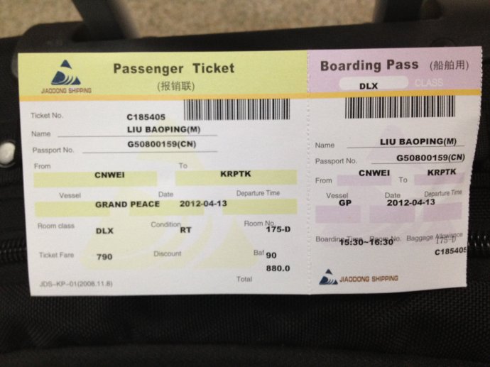 看,這是我們赴韓國的船票,大家可以看看,相信以后會(huì)用到的,嘻嘻。