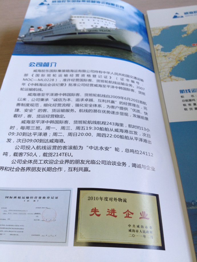 這是威海膠東國際集裝箱海運(yùn)有限公司的簡介以及他們所獲得獎(jiǎng)項(xiàng),而看到這些也讓我對威海碼頭更加從滿了信任。