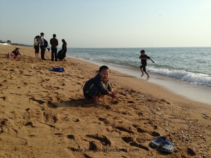 你看那個(gè)小男孩兒,被海浪打上來(lái)了吧,還是老實(shí)點(diǎn)兒玩沙子吧