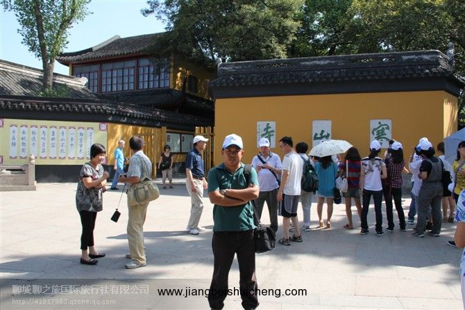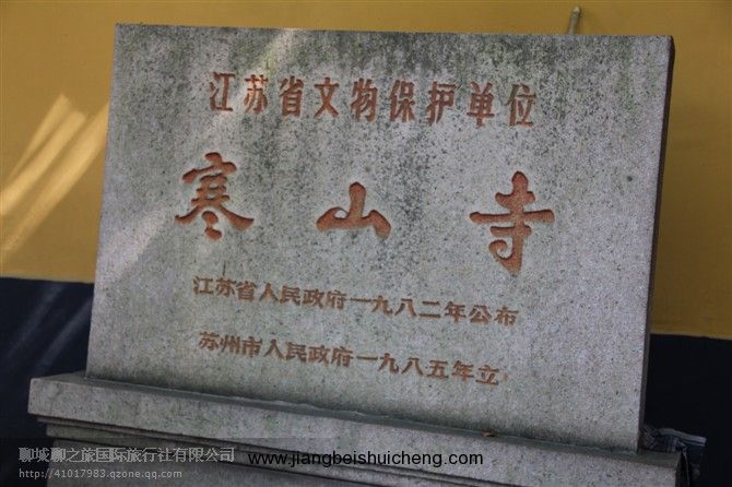 寒山寺(Hanshan Temple) 寒山寺在蘇州城西閶門外5公里外的楓橋鎮(zhèn),建于六朝時(shí)期的梁代天監(jiān)年間(公元502-519年),距今已有1400多年。原名“妙利普明塔院”。唐代貞觀年間,傳說當(dāng)時(shí)的名僧寒山和拾得曾由天臺(tái)山來此住持,改名寒山寺。今天我們的導(dǎo)游就帶大家來到了蘇州,看一下寒山寺。