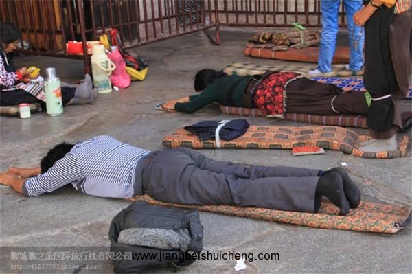 西藏是宗教文化的發(fā)源地,藏傳佛教具有鮮明的不同于其它佛教支派的高原特色,藏民在進行朝拜儀式。