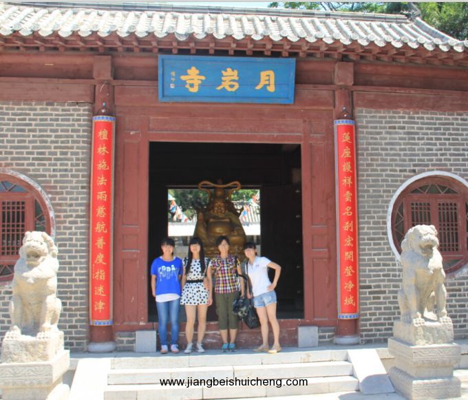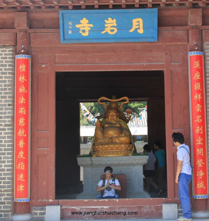 山坡上有一條新修建的臺階路,直通山頂。據(jù)當?shù)乩相l(xiāng)說,上面有一尊大佛,還有古長城圍墻。于是,雖然天氣炎熱,我們還是想一探究竟。臺階較陡,拾級而上不多時就汗流浹背氣喘吁吁。在半山腰山道左邊,一尊面目慈祥的石雕坐佛依山望湖。再往上,很快就登頂了,發(fā)現(xiàn)所謂的古長城圍墻不過是用碎石堆砌而成。下山之后,我們繼續(xù)驅(qū)車繞山而行,至山的背面,有一月巖寺。月巖寺坐落在昆山的西側(cè),一說創(chuàng)建于漢代,一說始建于唐代。其藏居深山,古樹掩映,晨鐘暮鼓方知山中有寺。