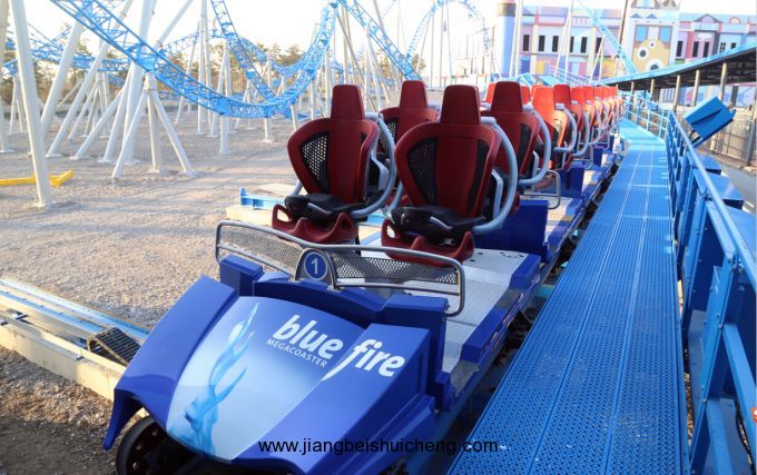 鎮(zhèn)園之寶世界之最——藍(lán)火過山車,由德國(guó)馬克公司原裝進(jìn)口,總造價(jià)1.2億,全長(zhǎng)1098米,至高點(diǎn)38米,最高時(shí)速可達(dá)100公里,采用火箭發(fā)射式原理,讓游客體驗(yàn)瞬間離地的超刺激、驚險(xiǎn)快感。