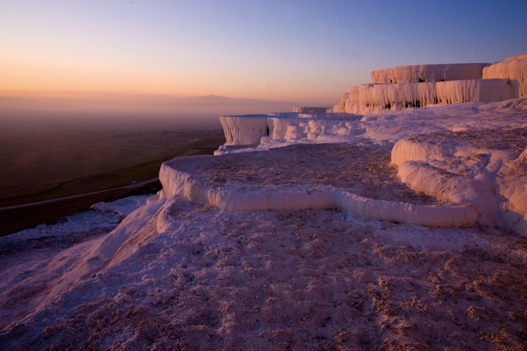 帕穆克卡萊又稱棉花堡,以其如棉花堆積而成的地貌而聞名于世。這里擁有土耳其最負盛名的溫泉,溫泉源自土耳其西安納托利亞的卡爾達吉山一側(cè),水溫37攝氏度,從地下汩汩冒出,經(jīng)過一系列“白色梯田”瀑布般流下。這些“白色梯田”均由泉水帶來的一種碳酸鈣白色物質(zhì)組成。在大約100階的“梯田”中,每一層都聚有水塘,泉水中含有的礦物質(zhì)為巖石表面涂上了令人驚奇的色彩和光澤。在棉花堡溫泉附近是建于公元前190年的赫拉波利斯城遺址。該城在古羅馬時代即是心臟病、皮膚病和風濕病患者的一個著名礦泉療養(yǎng)地。