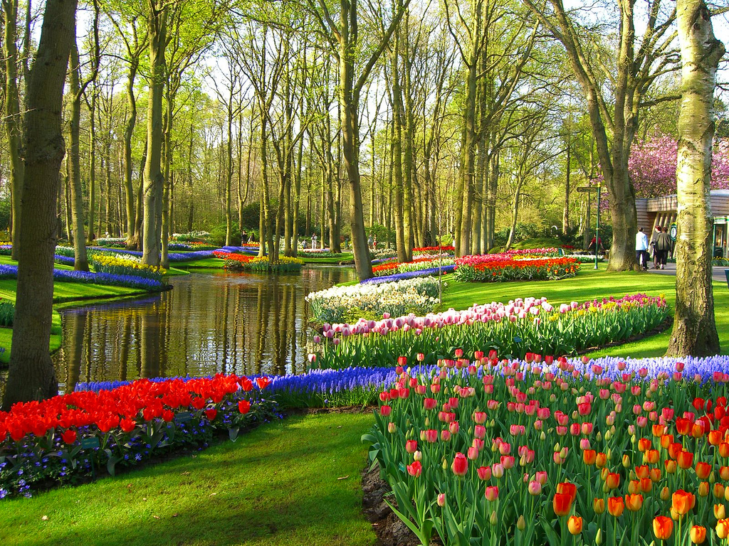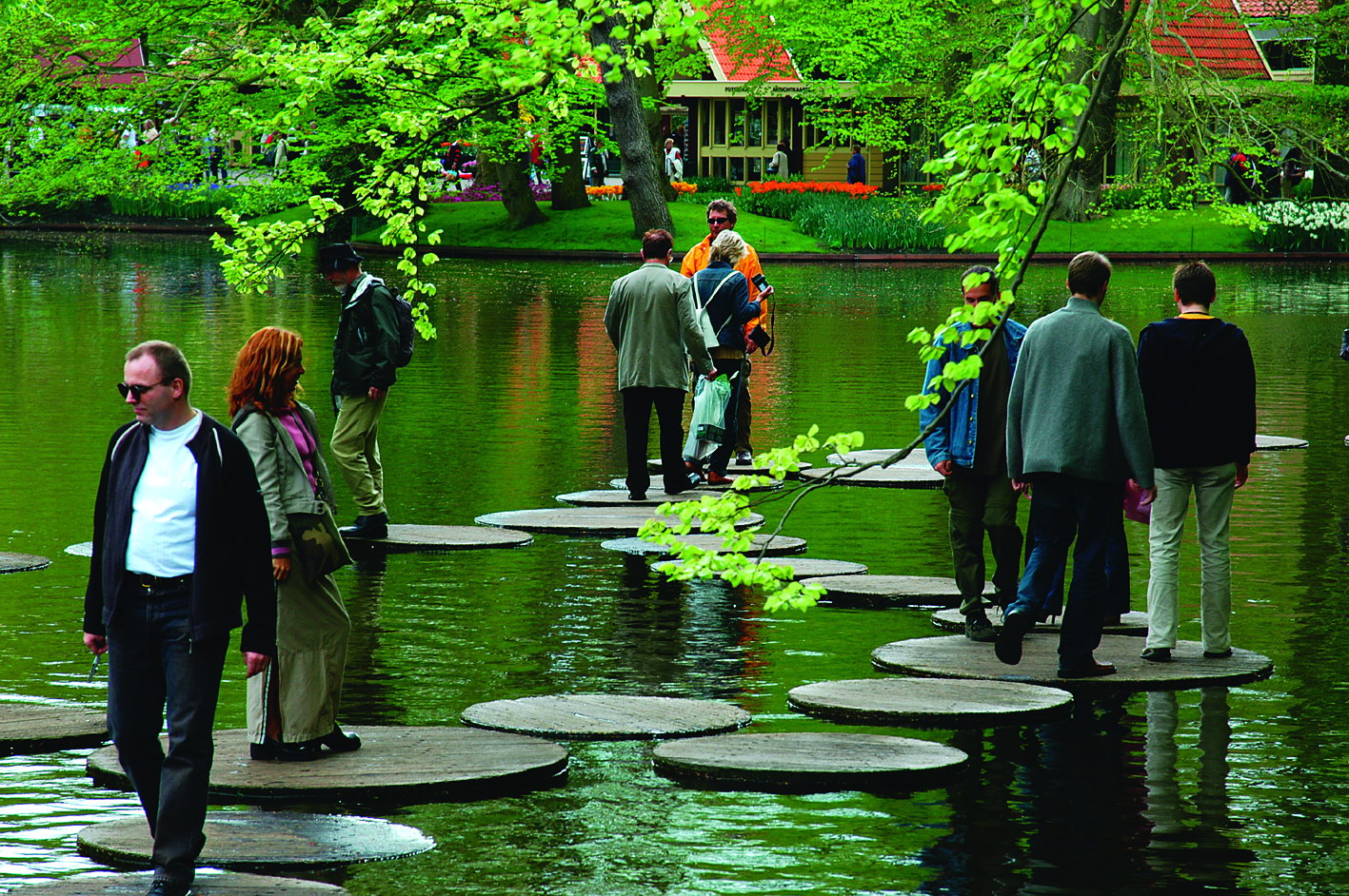 1830年荷蘭聘請(qǐng)德籍的景觀園藝家,設(shè)計(jì)庫(kù)肯霍夫公園(Keukenhof)的藍(lán)圖,公園整體的景觀設(shè)計(jì)以英式的風(fēng)格為主蜿蜒的林徑、幽靜的水池、噴泉交織著一叢叢的花圃,導(dǎo)覽游客參觀各式各樣盛開的花卉。
