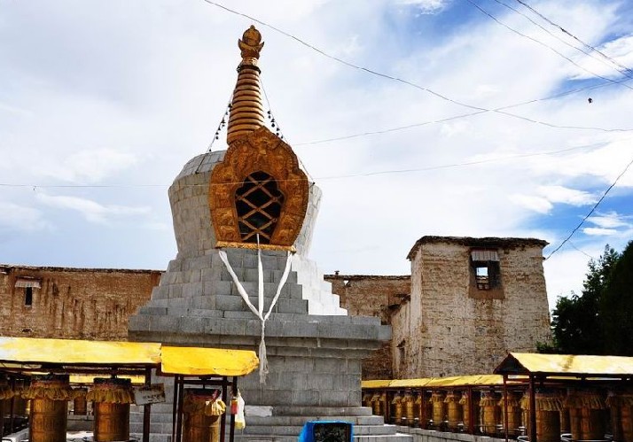 經(jīng)堂四壁遍繪壁畫,有釋迦牟尼傳記、六莊嚴(即龍樹、圣天、無著、世親、陳那和法稱)、密集金剛、西方有樂世界等題材。經(jīng)堂北側(cè)的羅漢殿(乃登拉康)供奉釋迦牟尼、十八羅漢和四大天王、馬頭金剛(為慈悲觀音的化身)、忿怒神(為佛在降魔除障時顯現(xiàn)的“法身”)等塑像。羅漢殿的東側(cè)是大威德殿(結(jié)幾拉康),主供大威德塑像(格魯派主修的護法神)。據(jù)說這尊神像是釋迦也失特請后藏雕塑家夏艾哇塑的。塑像腹是裝藏有熱羅扎哇的一個拇指,塑完后釋迦也失親自主持了開光誦經(jīng)儀式。大威德神像兩側(cè)共有吉祥天女、六臂依怙神、四臂依怙神、多聞天王、白梵天王等塑像。
