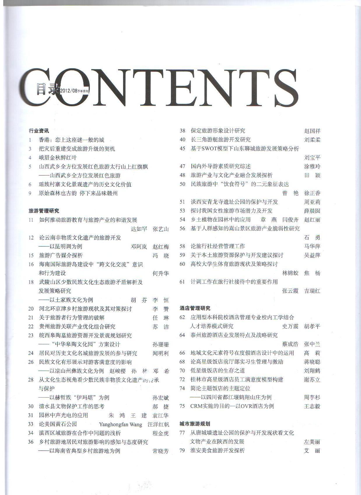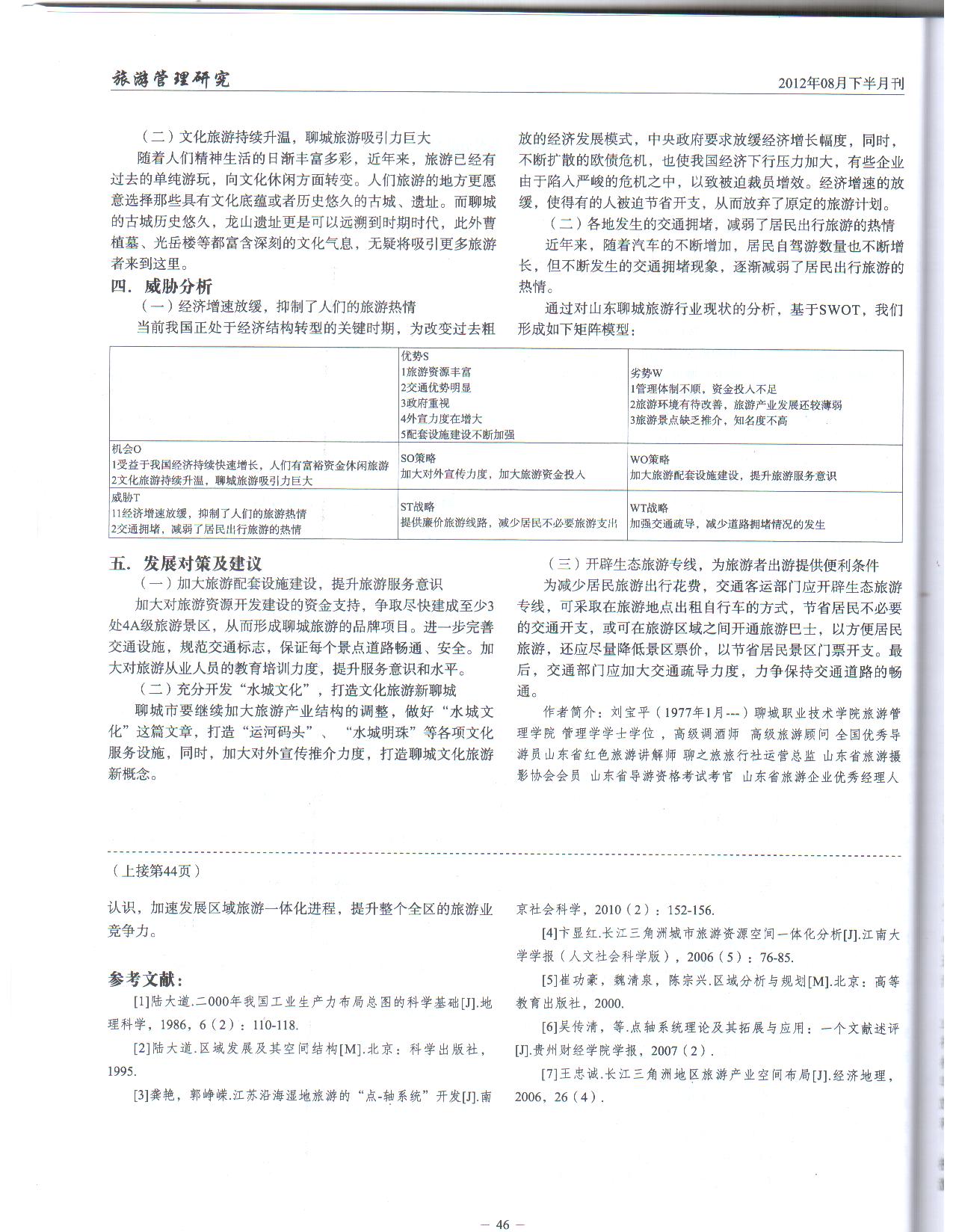 《旅游縱覽》(國家級(jí))發(fā)表劉寶平文章《基于SWOT模型下山東聊城旅游發(fā)展策略分析》刊登在2012年8月版。