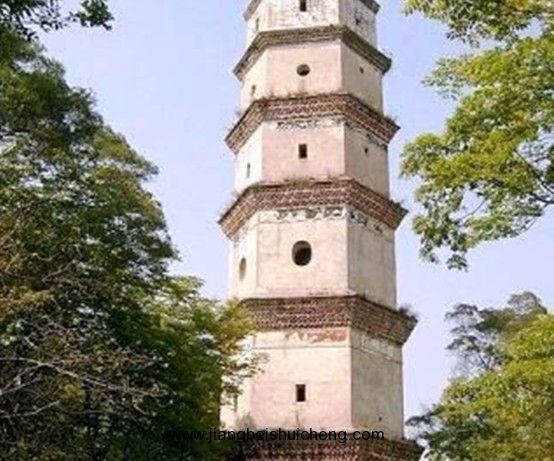 塔平面六邊形,底邊長3.9米,七層樓閣式磚塔,通高36米,塔身疊澀出檐。底層以及三至七層正面各開券頂門,二層各面相間開長方形、圓形窗,其余各層相間、上下相錯開5個方形窗。塔頂六角攢尖。塔內(nèi)各層設木樓板和木樓梯。門額有阮元題刻的“秀發(fā)梧江”、“觀文成化”、“光射牛斗”等石匾。1982年維修,改木樓梯為鐵樓梯。