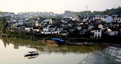 站在石壩上,舉首四望,氣象萬(wàn)千,盡收眼底。壩上碧波如鏡,魚翔深潭,小舟撥浪,激起漣漪,恬靜安閑。壩下亂石嶙峋,浪峰咬石;西岸巍然屹立的紫陽(yáng)山,林木蔥郁;建于明代的紫陽(yáng)橋,宛若彩虹橫臥清波,此橋長(zhǎng)140米,高14米,寬10米,在歙縣城的三座古橋中最高、最寬,因橋的上游即為徽商行舟的碼頭,所以橋孔建得比一般橋要高大得多,以便行舟過(guò)帆。