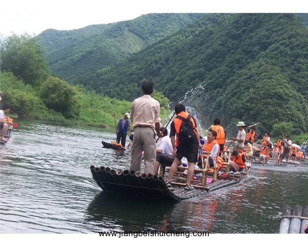 “江南第一漂”位于徽水河流經(jīng)涇縣的最后一段,上起烏溪鄉(xiāng)姚村,下止黃村鄉(xiāng),景區(qū)全長約20公里。景區(qū)內(nèi)河道蜿蜒曲折,水流湍急,兩岸層巒疊翠風光綺麗,是休閑旅游的好去處。徽水河漂流途經(jīng)五大景區(qū):起筏地叫龍?zhí)?,灘長浪急,游人在竹筏上隨浪俯仰,跌宕穿梭,一種戰(zhàn)勝大自然的酣暢淋漓之感油然而生。接下來是“早霧山”景區(qū)。這里終日云霧繚繞,而水平浪穩(wěn),版權所有,山東聊城聊之旅國際旅行社有限公司,轉(zhuǎn)載必究!使游人跌宕之心轉(zhuǎn)而為柔情愜意。早霧山下端河道突轉(zhuǎn)急彎,形成“刁潭”,岸邊巨石上的“潭古印”,版權所有,山東聊城聊之旅國際旅行有限公司轉(zhuǎn)載必究!形象地記錄了昔日放筏工艱難的歲月。這里不知有多少放筏工誤落水中,而落水者卻浮而不沉,因而留下了“刁潭不刁”的神奇?zhèn)髡f。而“胡老灣沖浪”則更是一彎三折,灘中有垅、垅中有灘,千余米的河道落花流水差一米多,游人最能體現(xiàn)“兩岸猿聲啼不住,輕舟已過萬重山”的古詩意境。急灘甫過,柳暗花明又一村——溪西山到了,這里山高水秀,常有云霧繚繞,村舍依山俯傍水而筑,是道地的農(nóng)家風光。沿流停筏,小扣柴扉,你能喝到頂級的綠茶“溪西山毛峰”。接下來便到了五雀嶺景區(qū),這里有雞公石、馬影石、木魚墩、百畝草坪、高灘晚釣、斷橋綠水等景點,人稱“江南小漓江”。