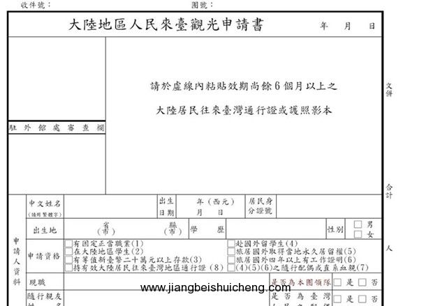 4)填寫完整的《北京市居民往來臺(tái)灣地區(qū)申請表》(出入境管理處提供)