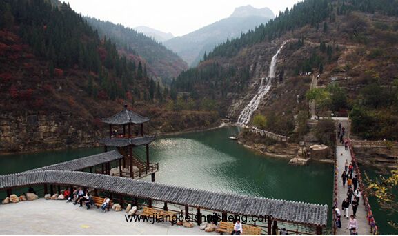 進(jìn)入山門,景區(qū)2公里的引導(dǎo)區(qū)域可乘旅游觀光車游覽,沿途懸崖峭壁,怪石林立,崖壁之上,或如人面,或如牛首,千姿百態(tài),惟妙惟肖。古松虬枝倒掛溪流兩岸,黃綠交融,相映成趣,青石小院點(diǎn)綴其間,構(gòu)成了一幅神奇的天然畫卷。游人所到之處,仿佛走進(jìn)了夢(mèng)境,無(wú)不驚嘆大自然的神功鬼斧。觀光車的盡頭是景區(qū)小廣場(chǎng),此處是游客休憩駐足之處,從這里出發(fā)景區(qū)的游覽才算是正式開(kāi)始。錯(cuò)落有致的三個(gè)形態(tài)迥異的瀑布吸引了游客的注意力,三合瀑、水簾瀑和歡喜瀑?gòu)膽已虑捅谏媳紴a而下的瀑水,猶如千軍萬(wàn)馬,層層飛瀉,聲勢(shì)浩蕩。游客從水簾洞中穿過(guò),頭上瀑布如雷鳴乍響,外面瀑布猶如水注,通過(guò)石壁水簾觀覽山中風(fēng)景別有韻味。