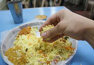 抓飯是新疆各族人民普遍喜愛的食物,維吾爾語稱其為“波羅”。做法是先用油炒洋蔥、胡蘿卜條、羊肉塊,然后放入淘凈的大米加水燜蒸。抓飯營養(yǎng)豐富,具有食補的功效,是維吾爾民族過節(jié)、待客的必備食品之一。因為最初是用手抓食的,故得此名。不過現(xiàn)在大家吃抓飯都改用筷子或勺子,不再直接下手抓啦。