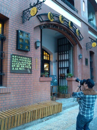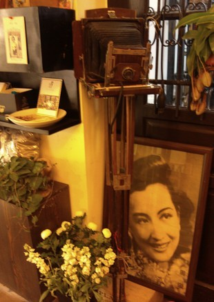 要轉(zhuǎn)身離開時(shí),忽然發(fā)現(xiàn)進(jìn)門處的一個(gè)角落里豎著一臺(tái)民國(guó)時(shí)期的照相機(jī),腳架下面是一副很大的民國(guó)女子的照片,看起來很像周璇,相片前面擺著白色的菊花。如果不是趕火車,我真想在這里喝一杯咖啡,慢慢地品味這安寧的時(shí)光。