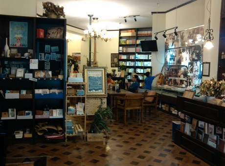 10月5日傍晚,我自青島嶗山坐304路公交車到棧橋時(shí),被一處紅磚墻的德式建筑所吸引:黑框的玻璃窗透出柔和的光,旁邊掛了一塊牌子,寫著“良友書坊”四個(gè)字;門口擺了幾盆花草,兩邊各有一盞像中世紀(jì)騎士頭盔似的燈,左邊上方的牌子上寫著“閱讀 咖啡 藝術(shù)”,下方的小黑板上寫著“始建于1901年的百年德式老建筑,膠澳德意志帝國(guó)郵局舊址,現(xiàn)為青島老城文化地標(biāo)良友書坊,主營(yíng)圖書、展覽、畫廊、咖啡、慢遞、花朵、服裝等”,貌似是用黃色的粉筆手寫而成的。