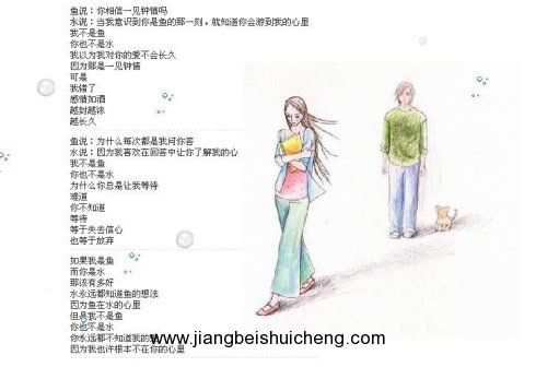 魚說:我不想讓你一個(gè)人面對(duì)風(fēng)浪。水說:我不會(huì)因此而感激你。魚說:我不想博得你的感激,我只想和你在一起。水說:你知道我不可能愛上你。魚說:但你不能剝奪我愛你的權(quán)利。水說:你這樣只會(huì)害了自己。水和魚經(jīng)過了一條大河,魚只剩下半條命。