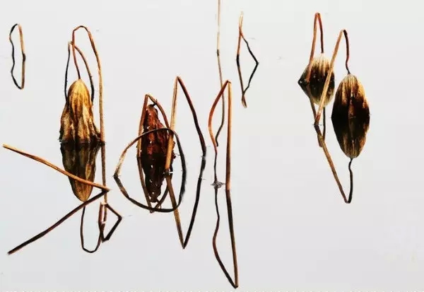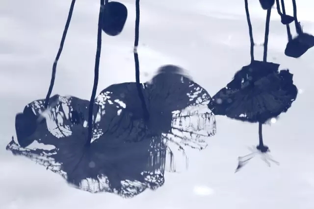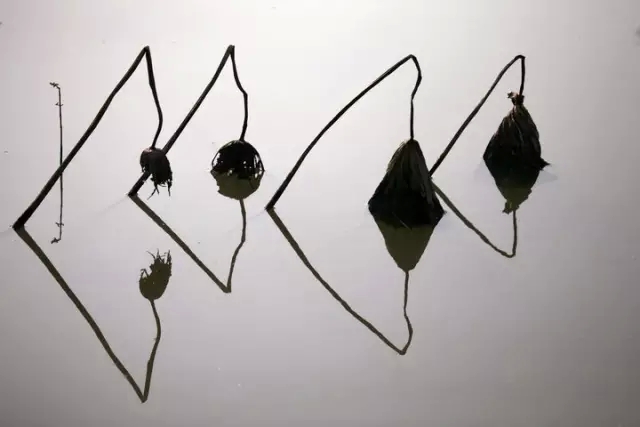 利用水中倒影來表現(xiàn)殘荷,使其增添一份凄清真實(shí)中帶著虛幻的味道。