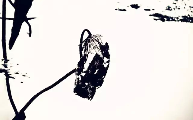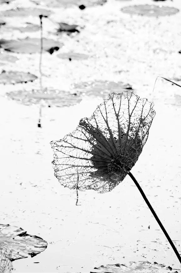 在色彩上也可以做減法,只留下黑白對(duì)比。去除了多余色彩的干擾,凸顯殘荷的形狀線條,更有了中國水墨畫的韻味。